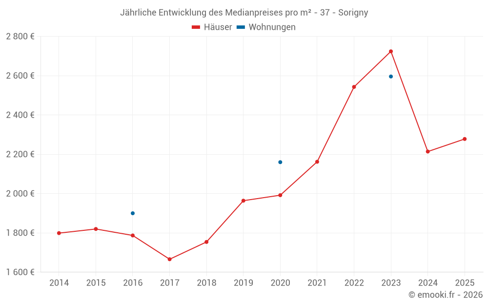 Der Durchschnittspreis auf den 22 Hausgeschäften der letzten 12 Monate in der Gemeinde Sorigny betrug 2 333 € pro Quadratmeter für einen mittleren Immobilienwert von 250 000 €. Über diesen Zeitraum hinweg lagen 60% der Transaktionen zwischen 1 823 und 2 915 € pro Quadratmeter (vom 2. bis zum 8. Dezil).