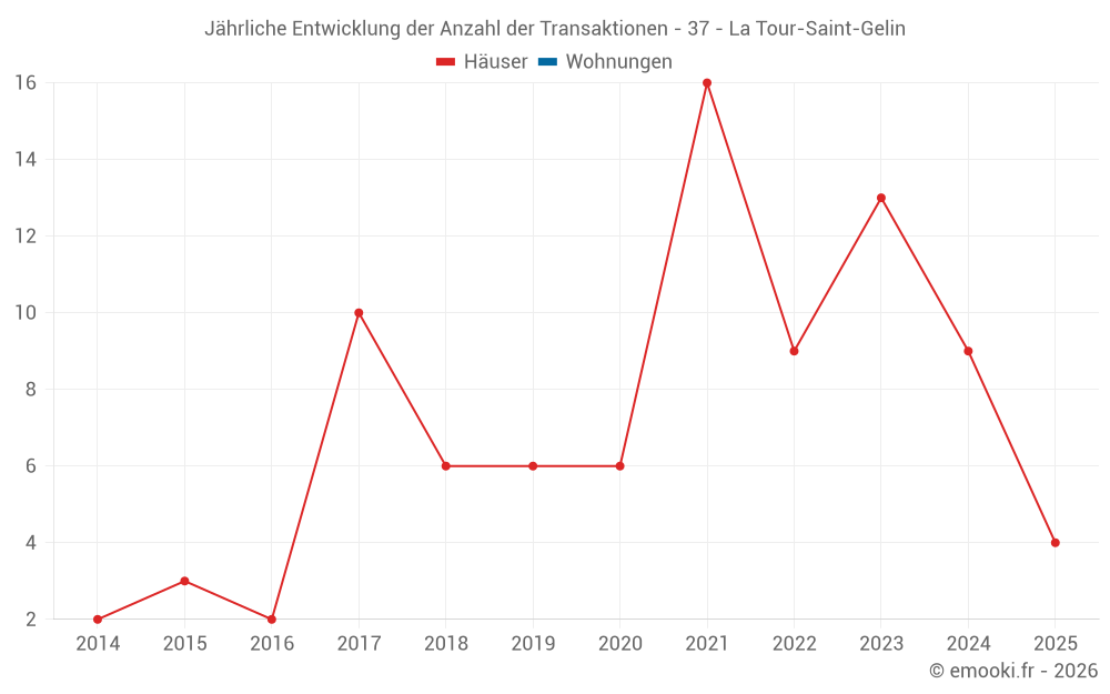 Der Durchschnittspreis auf den 19 Hausgeschäften der letzten 24 Monate in der Gemeinde La Tour-Saint-Gelin betrug 957 € pro Quadratmeter für einen mittleren Immobilienwert von 90 000 €. Über diesen Zeitraum hinweg lagen 60% der Transaktionen zwischen 594 und 1 569 € pro Quadratmeter (vom 2. bis zum 8. Dezil).