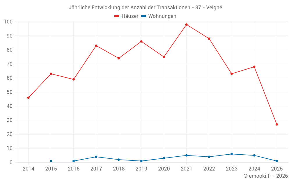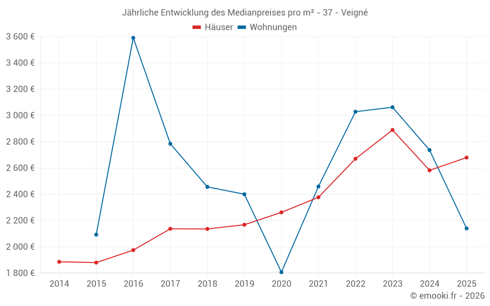 Der Durchschnittspreis auf den 27 Hausgeschäften der letzten 6 Monate in der Gemeinde Veigné betrug 2 679 € pro Quadratmeter für einen mittleren Immobilienwert von 262 000 €. Über diesen Zeitraum hinweg lagen 60% der Transaktionen zwischen 1 873 und 2 935 € pro Quadratmeter (vom 2. bis zum 8. Dezil).