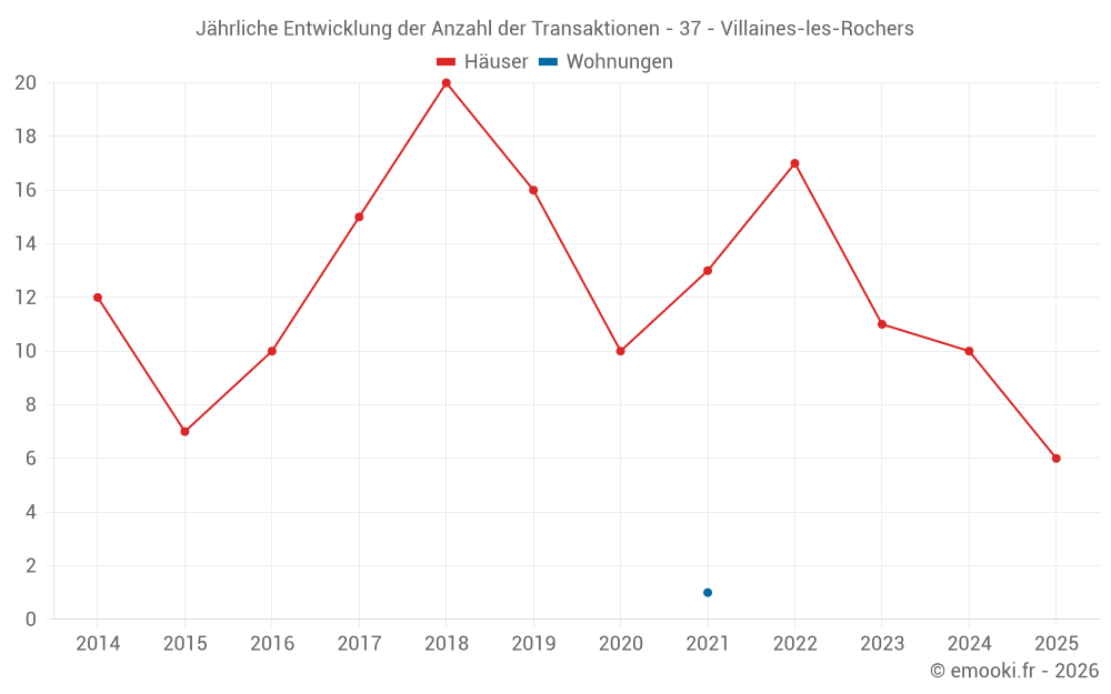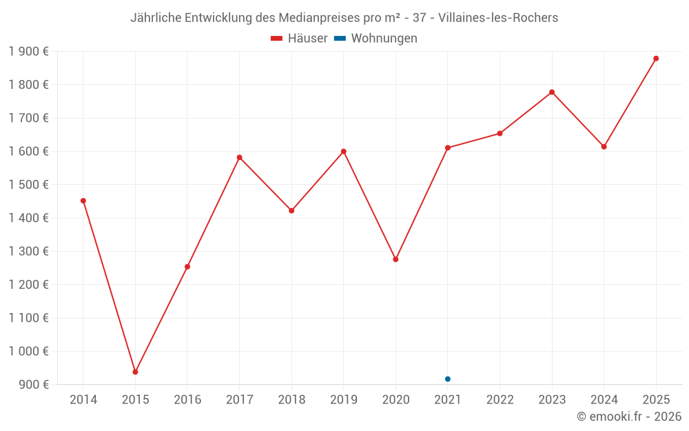Der Durchschnittspreis auf den 20 Hausgeschäften der letzten 24 Monate in der Gemeinde Villaines-les-Rochers betrug 1 614 € pro Quadratmeter für einen mittleren Immobilienwert von 173 500 €. Über diesen Zeitraum hinweg lagen 60% der Transaktionen zwischen 1 271 und 2 010 € pro Quadratmeter (vom 2. bis zum 8. Dezil).
