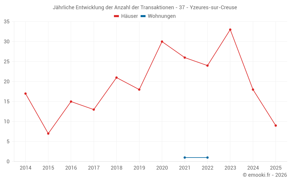 Der Durchschnittspreis auf den 19 Hausgeschäften der letzten 12 Monate in der Gemeinde Yzeures-sur-Creuse betrug 923 € pro Quadratmeter für einen mittleren Immobilienwert von 65 108 €. Über diesen Zeitraum hinweg lagen 60% der Transaktionen zwischen 466 und 1 310 € pro Quadratmeter (vom 2. bis zum 8. Dezil).