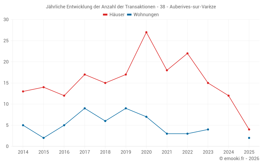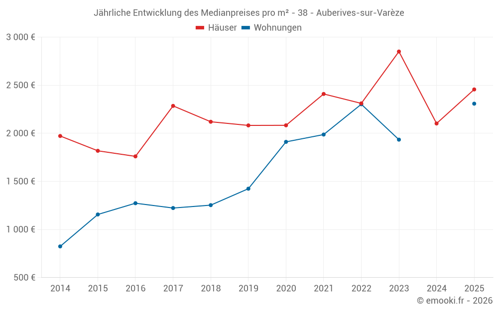 Der Durchschnittspreis auf den 22 Hausgeschäften der letzten 24 Monate in der Gemeinde Auberives-sur-Varèze betrug 2 452 € pro Quadratmeter für einen mittleren Immobilienwert von 231 000 €. Über diesen Zeitraum hinweg lagen 60% der Transaktionen zwischen 1 182 und 2 767 € pro Quadratmeter (vom 2. bis zum 8. Dezil).