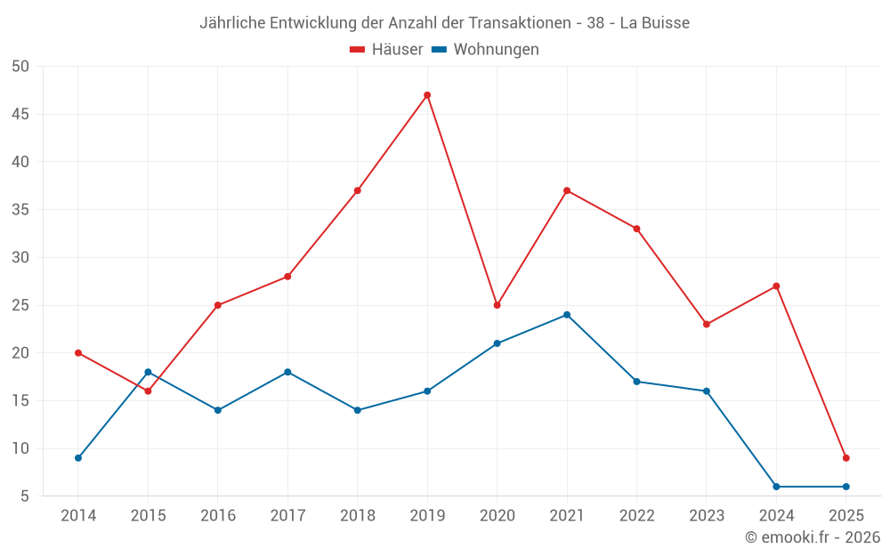 Der Durchschnittspreis auf den 22 Hausgeschäften der letzten 12 Monate in der Gemeinde La Buisse betrug 3 000 € pro Quadratmeter für einen mittleren Immobilienwert von 291 650 €. Über diesen Zeitraum hinweg lagen 60% der Transaktionen zwischen 1 626 und 4 137 € pro Quadratmeter (vom 2. bis zum 8. Dezil).