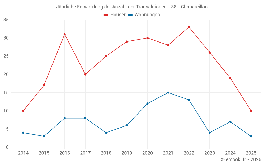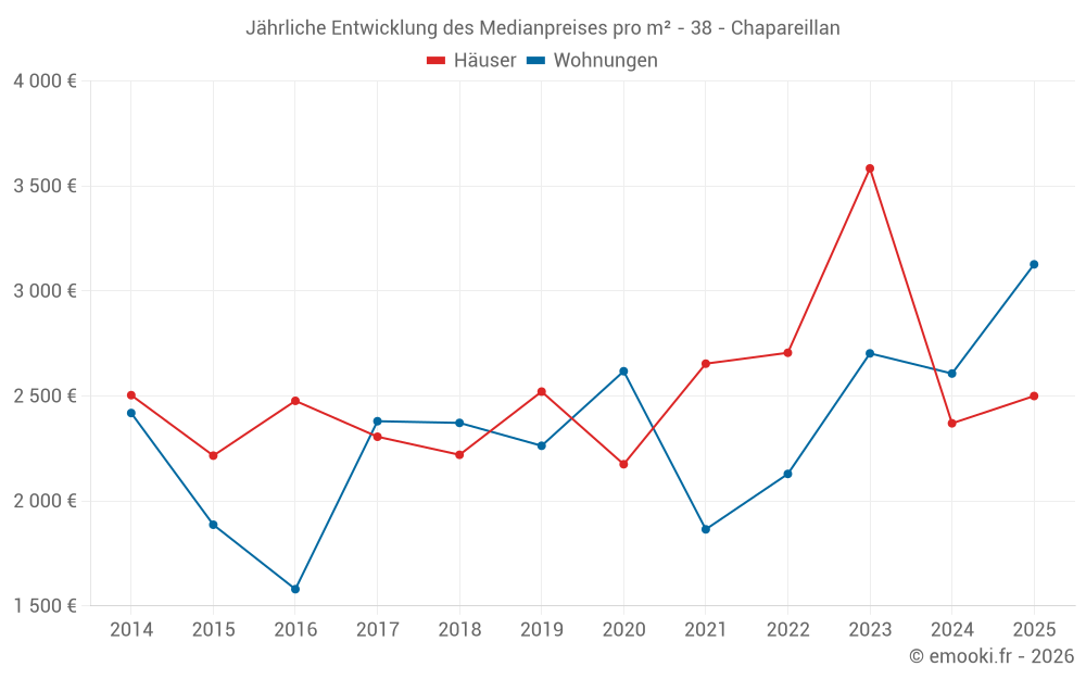Der Durchschnittspreis auf den 22 Hausgeschäften der letzten 12 Monate in der Gemeinde Chapareillan betrug 2 500 € pro Quadratmeter für einen mittleren Immobilienwert von 257 365 €. Über diesen Zeitraum hinweg lagen 60% der Transaktionen zwischen 1 169 und 3 383 € pro Quadratmeter (vom 2. bis zum 8. Dezil).
