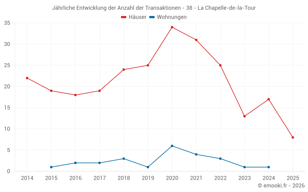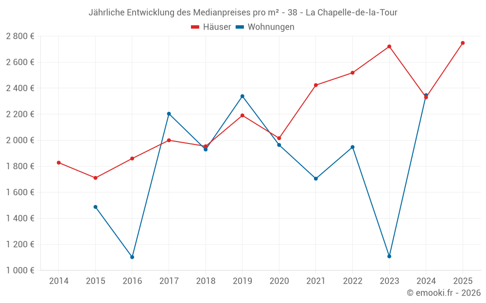 Der Durchschnittspreis auf den 32 Hausgeschäften der letzten 24 Monate in der Gemeinde La Chapelle-de-la-Tour betrug 2 446 € pro Quadratmeter für einen mittleren Immobilienwert von 249 695 €. Über diesen Zeitraum hinweg lagen 60% der Transaktionen zwischen 1 883 und 3 184 € pro Quadratmeter (vom 2. bis zum 8. Dezil).