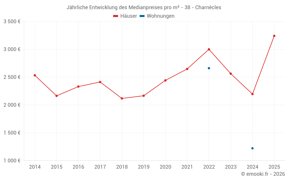 Der Durchschnittspreis auf den 25 Hausgeschäften der letzten 24 Monate in der Gemeinde Charnècles betrug 2 463 € pro Quadratmeter für einen mittleren Immobilienwert von 322 450 €. Über diesen Zeitraum hinweg lagen 60% der Transaktionen zwischen 1 711 und 3 121 € pro Quadratmeter (vom 2. bis zum 8. Dezil).