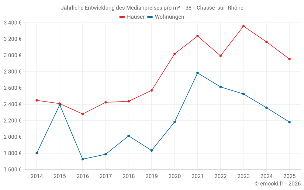 Der Durchschnittspreis auf den 30 Wohnungstransaktionen der letzten 24 Monate in der Gemeinde Chasse-sur-Rhône betrug 2 274 € pro Quadratmeter für einen mittleren Immobilienwert von 175 400 €. Über diesen Zeitraum hinweg lagen 60% der Transaktionen zwischen 2 014 und 2 957 € pro Quadratmeter (vom 2. bis zum 8. Dezil).