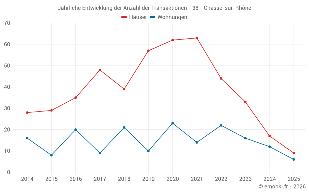Der Durchschnittspreis auf den 23 Hausgeschäften der letzten 12 Monate in der Gemeinde Chasse-sur-Rhône betrug 3 165 € pro Quadratmeter für einen mittleren Immobilienwert von 304 000 €. Über diesen Zeitraum hinweg lagen 60% der Transaktionen zwischen 2 262 und 3 645 € pro Quadratmeter (vom 2. bis zum 8. Dezil).
