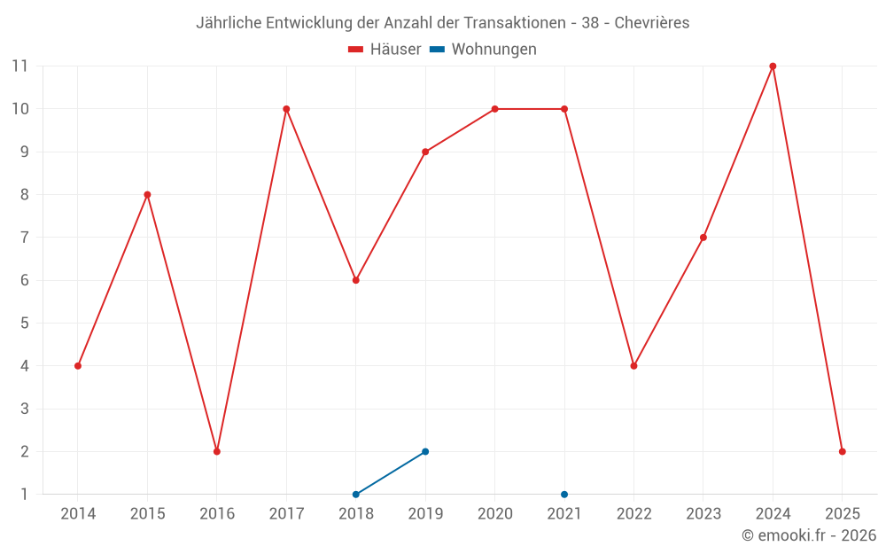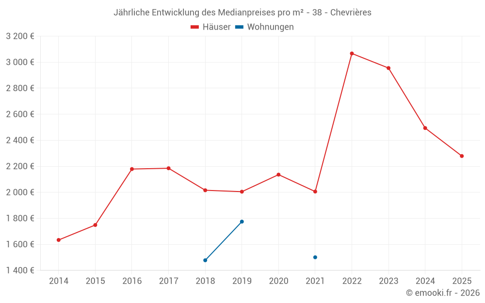 Der Durchschnittspreis auf den 15 Hausgeschäften der letzten 24 Monate in der Gemeinde Chevrières betrug 2 494 € pro Quadratmeter für einen mittleren Immobilienwert von 304 000 €. Über diesen Zeitraum hinweg lagen 60% der Transaktionen zwischen 1 893 und 2 999 € pro Quadratmeter (vom 2. bis zum 8. Dezil).