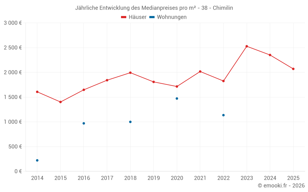 Der Durchschnittspreis auf den 16 Hausgeschäften der letzten 12 Monate in der Gemeinde Chimilin betrug 2 125 € pro Quadratmeter für einen mittleren Immobilienwert von 239 000 €. Über diesen Zeitraum hinweg lagen 60% der Transaktionen zwischen 1 724 und 2 782 € pro Quadratmeter (vom 2. bis zum 8. Dezil).
