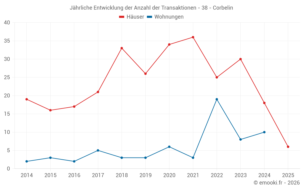 Der Durchschnittspreis auf den 38 Hausgeschäften der letzten 24 Monate in der Gemeinde Corbelin betrug 2 074 € pro Quadratmeter für einen mittleren Immobilienwert von 197 690 €. Über diesen Zeitraum hinweg lagen 60% der Transaktionen zwischen 1 258 und 2 608 € pro Quadratmeter (vom 2. bis zum 8. Dezil).