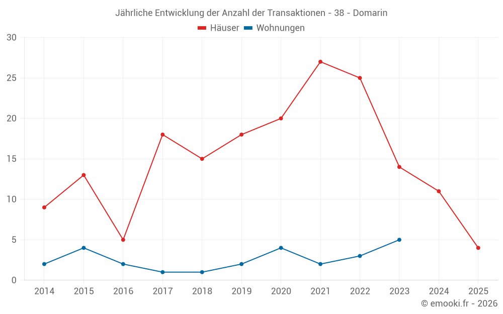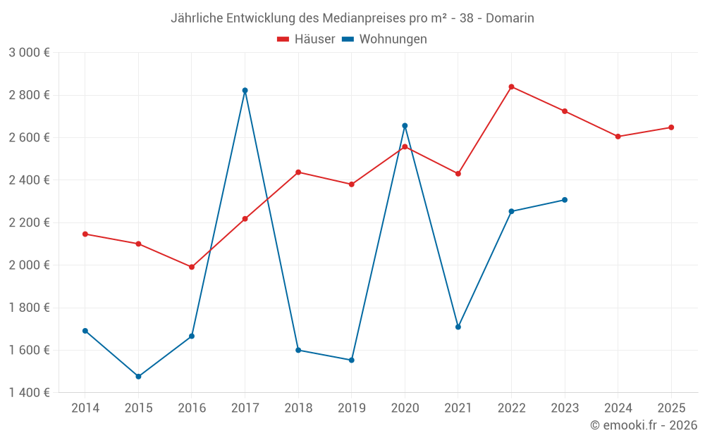 Der Durchschnittspreis auf den 26 Hausgeschäften der letzten 24 Monate in der Gemeinde Domarin betrug 2 777 € pro Quadratmeter für einen mittleren Immobilienwert von 284 000 €. Über diesen Zeitraum hinweg lagen 60% der Transaktionen zwischen 2 149 und 3 714 € pro Quadratmeter (vom 2. bis zum 8. Dezil).