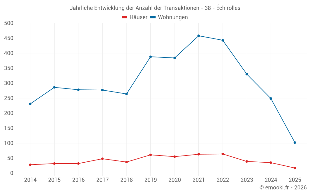 Der Durchschnittspreis auf den 42 Hausgeschäften der letzten 12 Monate in der Gemeinde Échirolles betrug 3 173 € pro Quadratmeter für einen mittleren Immobilienwert von 294 500 €. Über diesen Zeitraum hinweg lagen 60% der Transaktionen zwischen 2 763 und 3 753 € pro Quadratmeter (vom 2. bis zum 8. Dezil).
