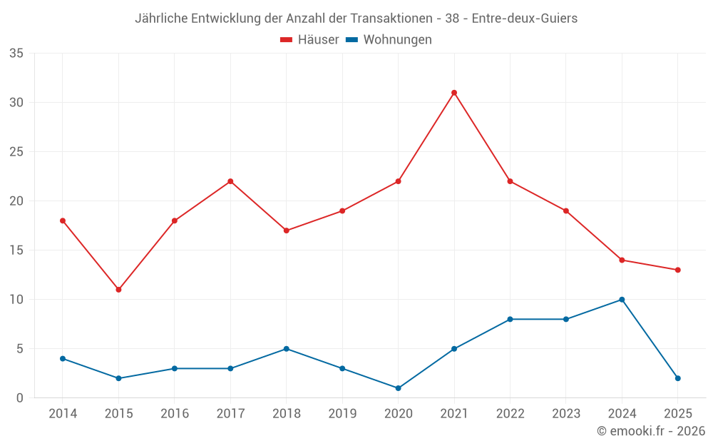 Der Durchschnittspreis auf den 21 Hausgeschäften der letzten 12 Monate in der Gemeinde Entre-deux-Guiers betrug 2 216 € pro Quadratmeter für einen mittleren Immobilienwert von 212 000 €. Über diesen Zeitraum hinweg lagen 60% der Transaktionen zwischen 1 604 und 2 881 € pro Quadratmeter (vom 2. bis zum 8. Dezil).