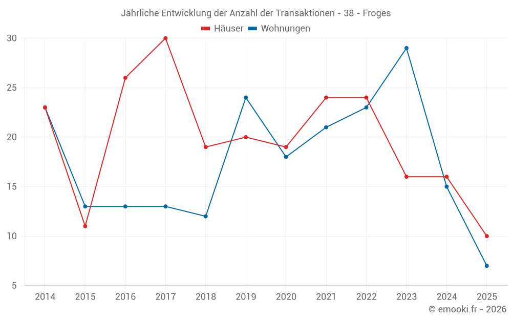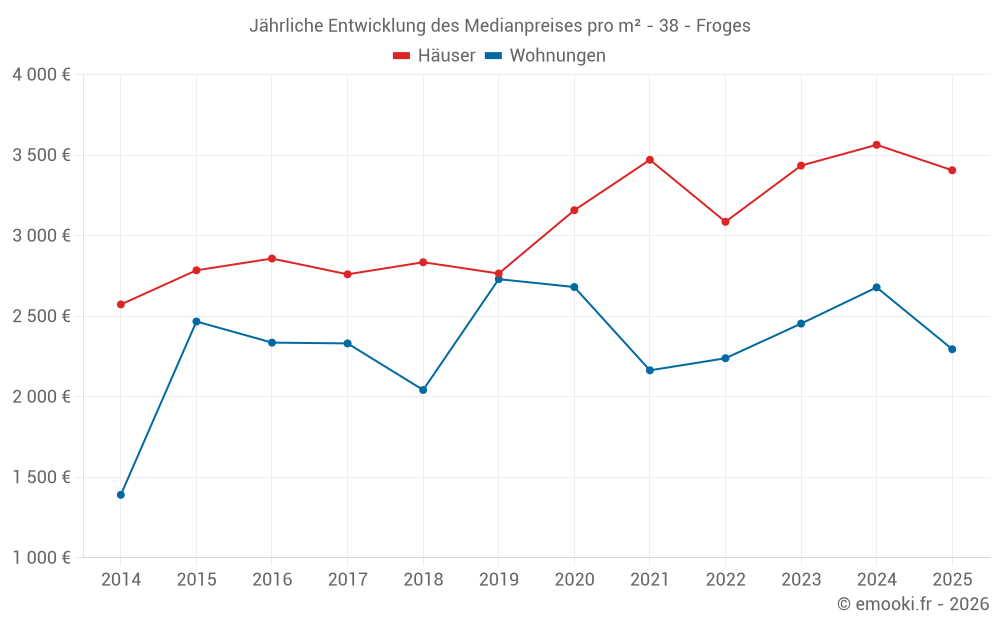 Der Durchschnittspreis auf den 19 Hausgeschäften der letzten 12 Monate in der Gemeinde Froges betrug 3 525 € pro Quadratmeter für einen mittleren Immobilienwert von 315 000 €. Über diesen Zeitraum hinweg lagen 60% der Transaktionen zwischen 2 306 und 4 326 € pro Quadratmeter (vom 2. bis zum 8. Dezil).