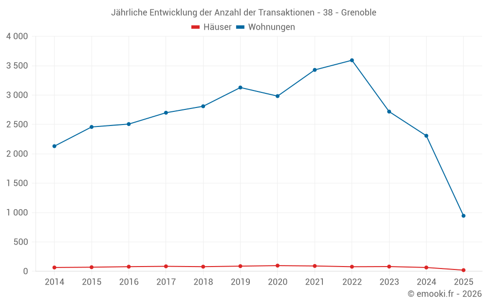 Der Durchschnittspreis auf den 20 Hausgeschäften der letzten 6 Monate in der Gemeinde Grenoble betrug 3 203 € pro Quadratmeter für einen mittleren Immobilienwert von 260 895 €. Über diesen Zeitraum hinweg lagen 60% der Transaktionen zwischen 2 464 und 4 187 € pro Quadratmeter (vom 2. bis zum 8. Dezil).