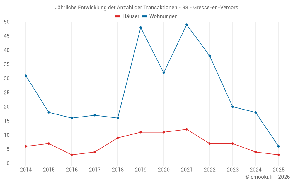 Der Durchschnittspreis auf den 19 Wohnungstransaktionen der letzten 12 Monate in der Gemeinde Gresse-en-Vercors betrug 2 333 € pro Quadratmeter für einen mittleren Immobilienwert von 57 380 €. Über diesen Zeitraum hinweg lagen 60% der Transaktionen zwischen 2 046 und 2 483 € pro Quadratmeter (vom 2. bis zum 8. Dezil).