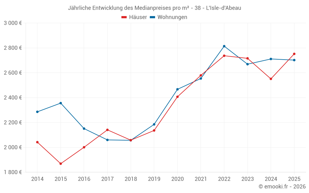 Der Durchschnittspreis auf den 26 Hausgeschäften der letzten 6 Monate in der Gemeinde L'Isle-d'Abeau betrug 2 752 € pro Quadratmeter für einen mittleren Immobilienwert von 246 650 €. Über diesen Zeitraum hinweg lagen 60% der Transaktionen zwischen 2 081 und 3 552 € pro Quadratmeter (vom 2. bis zum 8. Dezil).