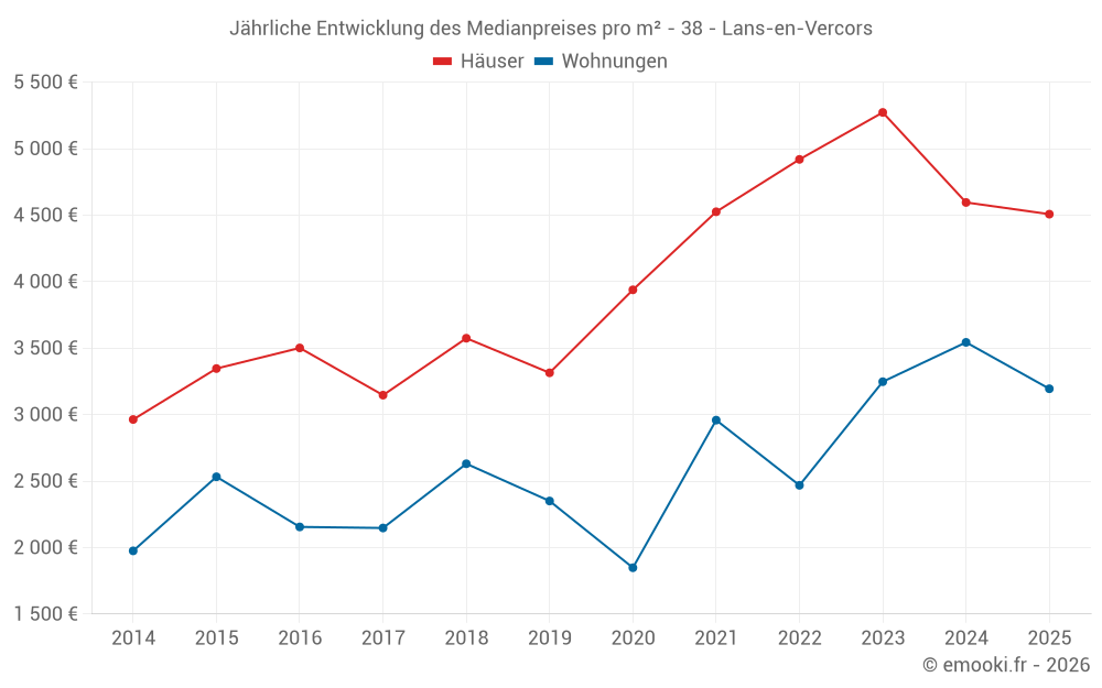 Der Durchschnittspreis auf den 20 Hausgeschäften der letzten 12 Monate in der Gemeinde Lans-en-Vercors betrug 4 506 € pro Quadratmeter für einen mittleren Immobilienwert von 428 850 €. Über diesen Zeitraum hinweg lagen 60% der Transaktionen zwischen 3 539 und 5 638 € pro Quadratmeter (vom 2. bis zum 8. Dezil).