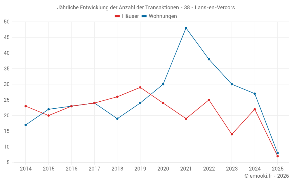 Der Durchschnittspreis auf den 18 Wohnungstransaktionen der letzten 12 Monate in der Gemeinde Lans-en-Vercors betrug 3 574 € pro Quadratmeter für einen mittleren Immobilienwert von 103 746 €. Über diesen Zeitraum hinweg lagen 60% der Transaktionen zwischen 2 465 und 4 215 € pro Quadratmeter (vom 2. bis zum 8. Dezil).
