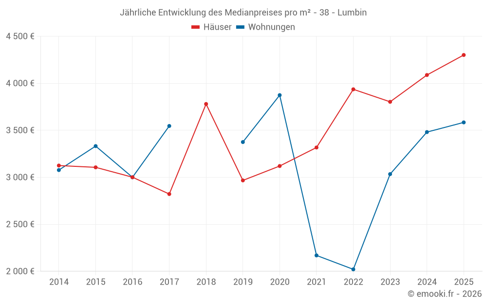 Der Durchschnittspreis auf den 27 Hausgeschäften der letzten 24 Monate in der Gemeinde Lumbin betrug 3 875 € pro Quadratmeter für einen mittleren Immobilienwert von 446 500 €. Über diesen Zeitraum hinweg lagen 60% der Transaktionen zwischen 2 600 und 4 512 € pro Quadratmeter (vom 2. bis zum 8. Dezil).
