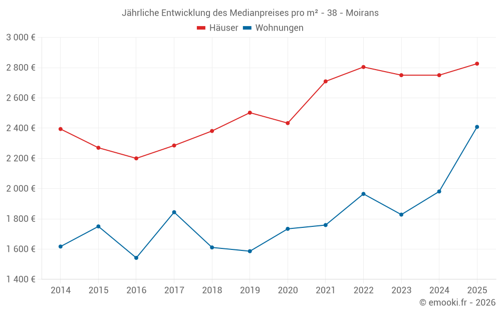 Der Durchschnittspreis auf den 41 Hausgeschäften der letzten 12 Monate in der Gemeinde Moirans betrug 2 775 € pro Quadratmeter für einen mittleren Immobilienwert von 280 000 €. Über diesen Zeitraum hinweg lagen 60% der Transaktionen zwischen 2 222 und 3 331 € pro Quadratmeter (vom 2. bis zum 8. Dezil).