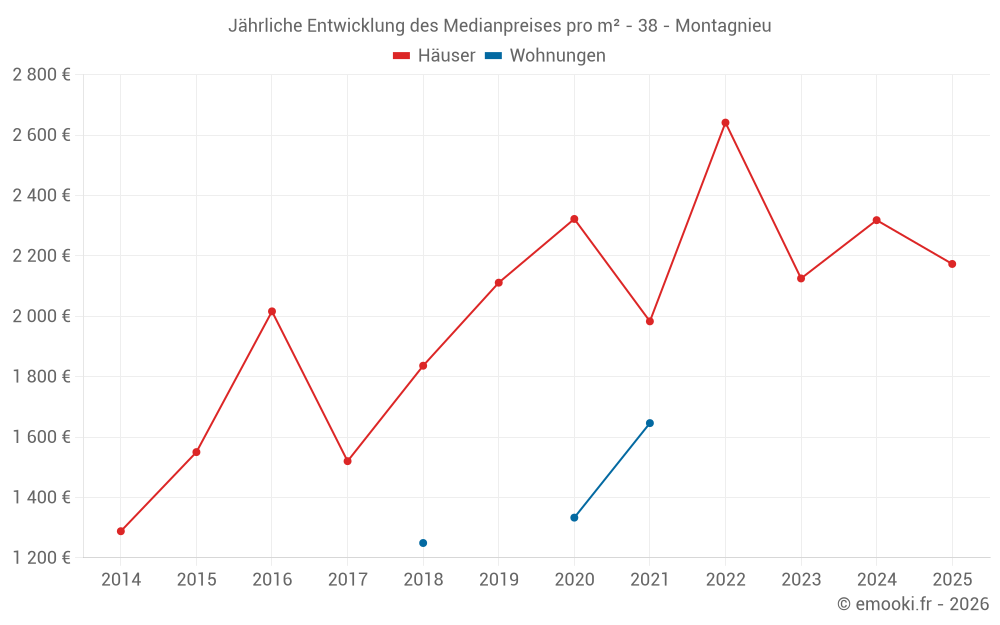Der Durchschnittspreis auf den 14 Hausgeschäften der letzten 24 Monate in der Gemeinde Montagnieu betrug 2 108 € pro Quadratmeter für einen mittleren Immobilienwert von 217 500 €. Über diesen Zeitraum hinweg lagen 60% der Transaktionen zwischen 1 589 und 2 553 € pro Quadratmeter (vom 2. bis zum 8. Dezil).