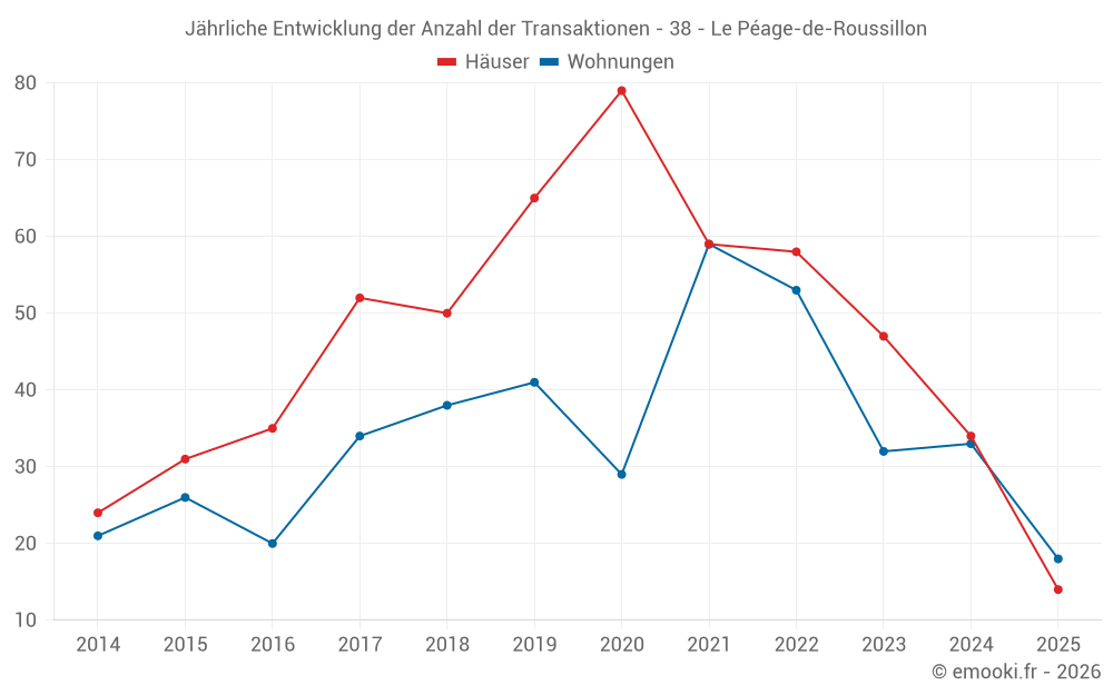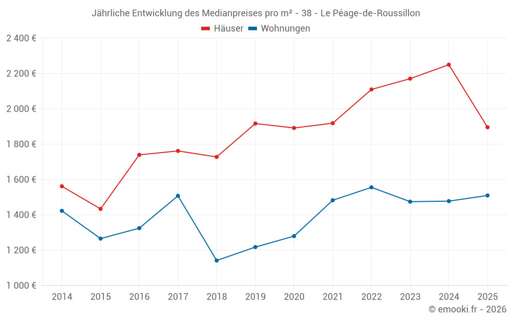 Der Durchschnittspreis auf den 32 Hausgeschäften der letzten 12 Monate in der Gemeinde Le Péage-de-Roussillon betrug 2 148 € pro Quadratmeter für einen mittleren Immobilienwert von 182 000 €. Über diesen Zeitraum hinweg lagen 60% der Transaktionen zwischen 1 456 und 2 455 € pro Quadratmeter (vom 2. bis zum 8. Dezil).