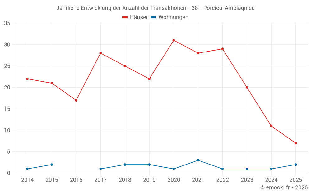 Der Durchschnittspreis auf den 31 Hausgeschäften der letzten 24 Monate in der Gemeinde Porcieu-Amblagnieu betrug 2 083 € pro Quadratmeter für einen mittleren Immobilienwert von 190 000 €. Über diesen Zeitraum hinweg lagen 60% der Transaktionen zwischen 1 341 und 2 766 € pro Quadratmeter (vom 2. bis zum 8. Dezil).