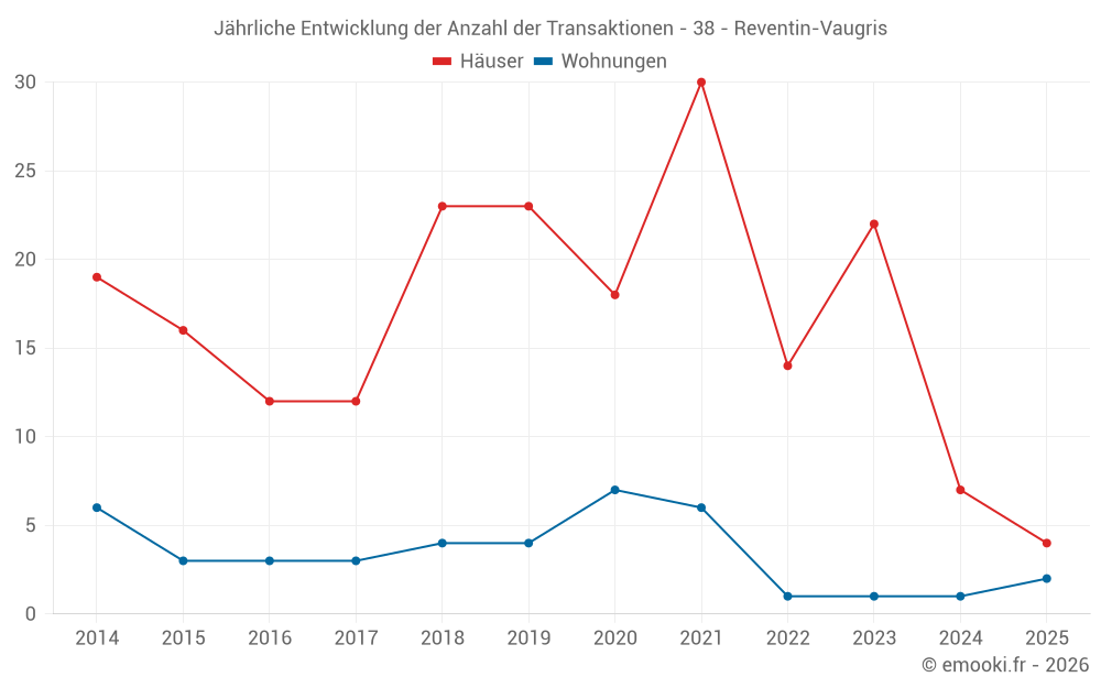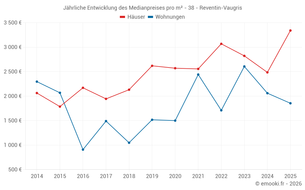 Der Durchschnittspreis auf den 24 Hausgeschäften der letzten 24 Monate in der Gemeinde Reventin-Vaugris betrug 2 822 € pro Quadratmeter für einen mittleren Immobilienwert von 274 250 €. Über diesen Zeitraum hinweg lagen 60% der Transaktionen zwischen 2 025 und 3 295 € pro Quadratmeter (vom 2. bis zum 8. Dezil).