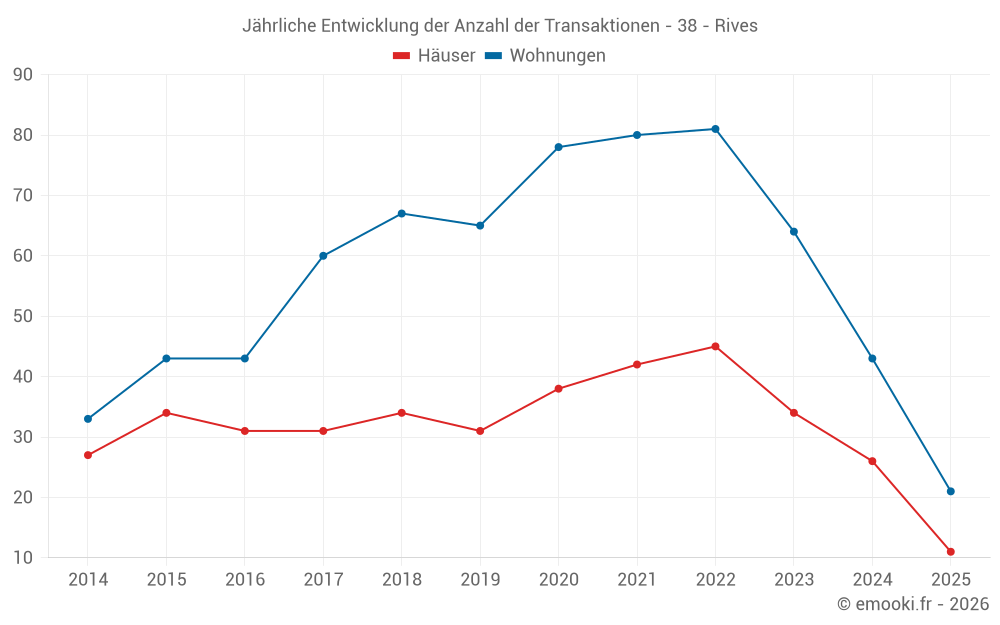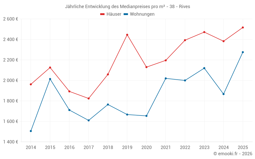 Der Durchschnittspreis auf den 21 Hausgeschäften der letzten 12 Monate in der Gemeinde Rives betrug 2 541 € pro Quadratmeter für einen mittleren Immobilienwert von 249 000 €. Über diesen Zeitraum hinweg lagen 60% der Transaktionen zwischen 2 024 und 3 113 € pro Quadratmeter (vom 2. bis zum 8. Dezil).