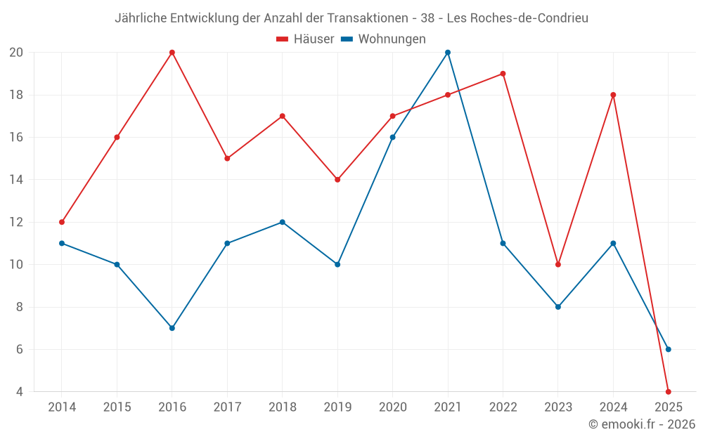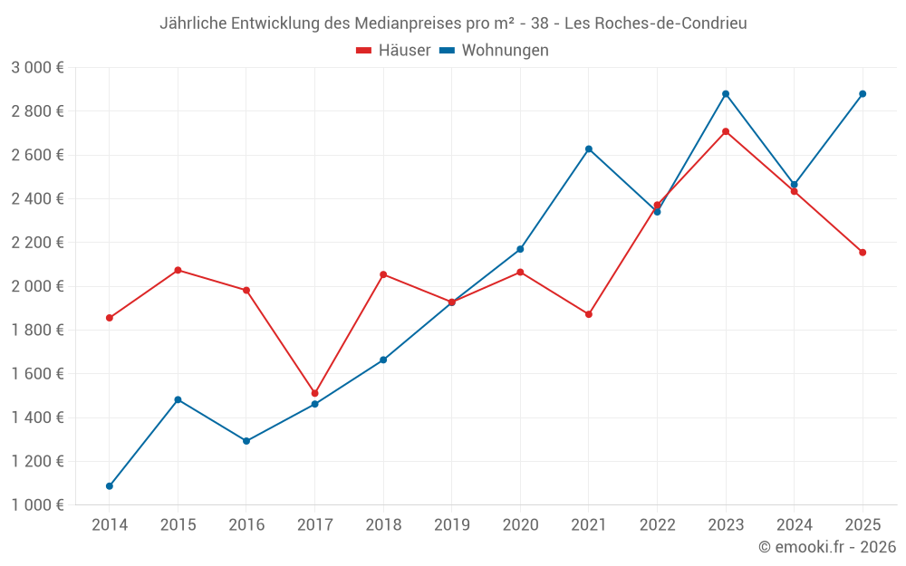 Der Durchschnittspreis auf den 28 Hausgeschäften der letzten 24 Monate in der Gemeinde Les Roches-de-Condrieu betrug 2 464 € pro Quadratmeter für einen mittleren Immobilienwert von 219 350 €. Über diesen Zeitraum hinweg lagen 60% der Transaktionen zwischen 1 572 und 2 963 € pro Quadratmeter (vom 2. bis zum 8. Dezil).