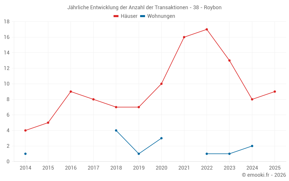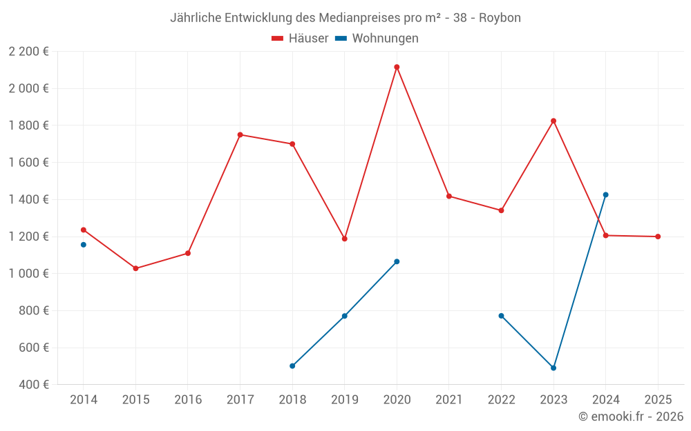 Der Durchschnittspreis auf den 24 Hausgeschäften der letzten 24 Monate in der Gemeinde Roybon betrug 1 673 € pro Quadratmeter für einen mittleren Immobilienwert von 175 225 €. Über diesen Zeitraum hinweg lagen 60% der Transaktionen zwischen 857 und 2 502 € pro Quadratmeter (vom 2. bis zum 8. Dezil).