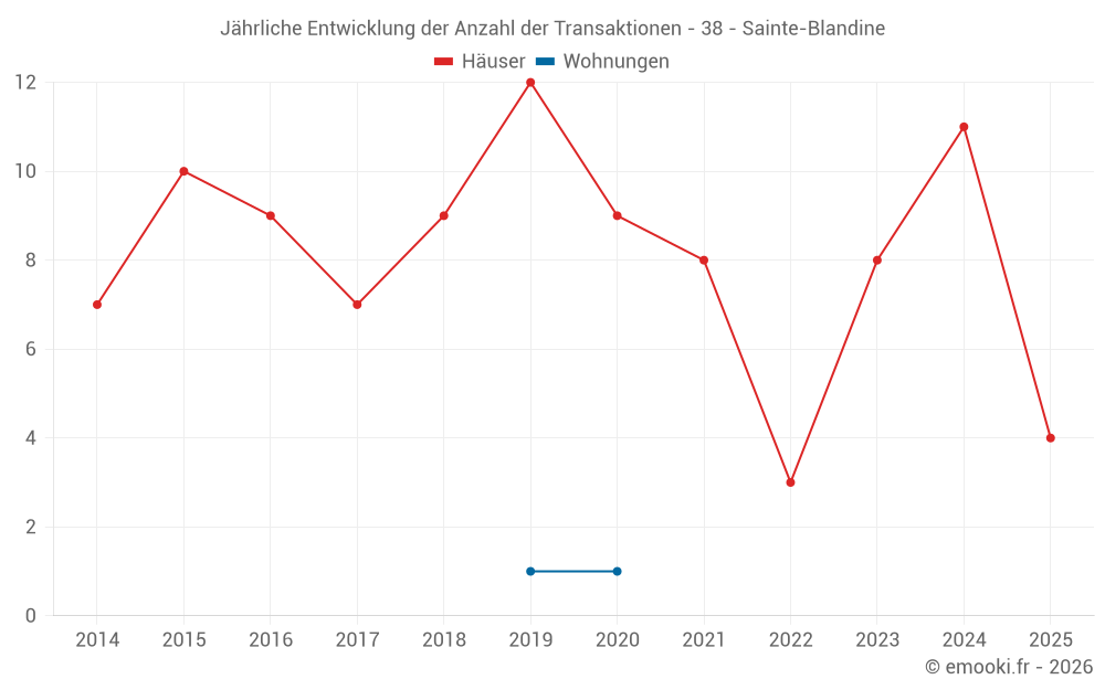Der Durchschnittspreis auf den 18 Hausgeschäften der letzten 24 Monate in der Gemeinde Sainte-Blandine betrug 2 553 € pro Quadratmeter für einen mittleren Immobilienwert von 263 500 €. Über diesen Zeitraum hinweg lagen 60% der Transaktionen zwischen 1 941 und 3 075 € pro Quadratmeter (vom 2. bis zum 8. Dezil).