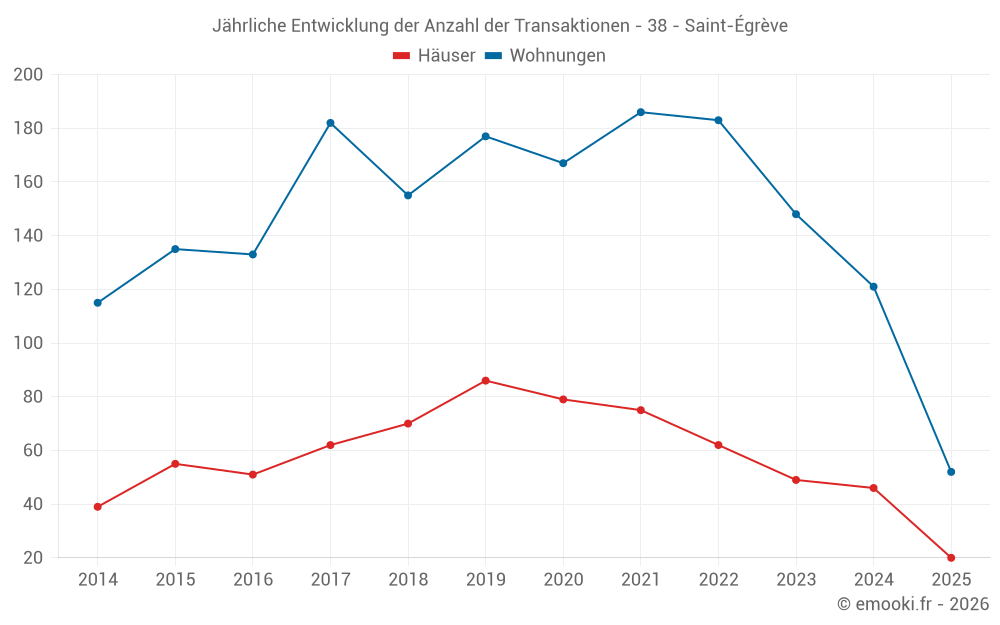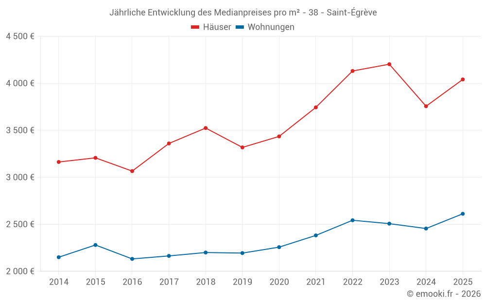 Der Durchschnittspreis auf den 52 Wohnungstransaktionen der letzten 6 Monate in der Gemeinde Saint-Égrève betrug 2 612 € pro Quadratmeter für einen mittleren Immobilienwert von 204 000 €. Über diesen Zeitraum hinweg lagen 60% der Transaktionen zwischen 2 050 und 3 371 € pro Quadratmeter (vom 2. bis zum 8. Dezil).