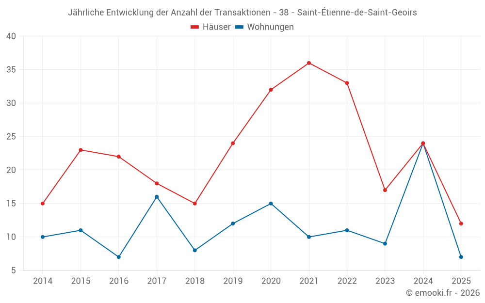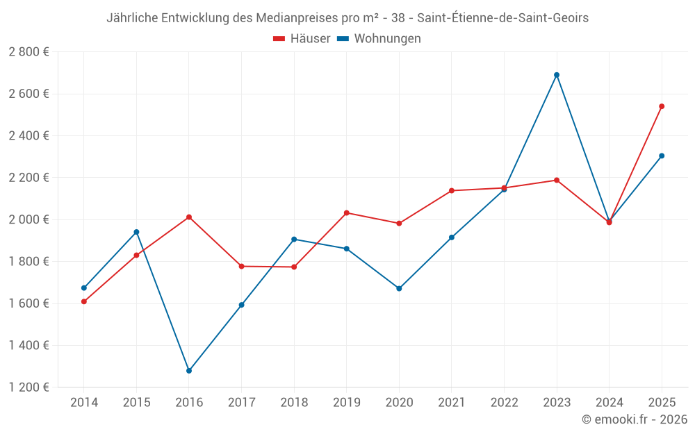 Der Durchschnittspreis auf den 24 Wohnungstransaktionen der letzten 12 Monate in der Gemeinde Saint-Étienne-de-Saint-Geoirs betrug 2 176 € pro Quadratmeter für einen mittleren Immobilienwert von 150 250 €. Über diesen Zeitraum hinweg lagen 60% der Transaktionen zwischen 1 548 und 2 591 € pro Quadratmeter (vom 2. bis zum 8. Dezil).
