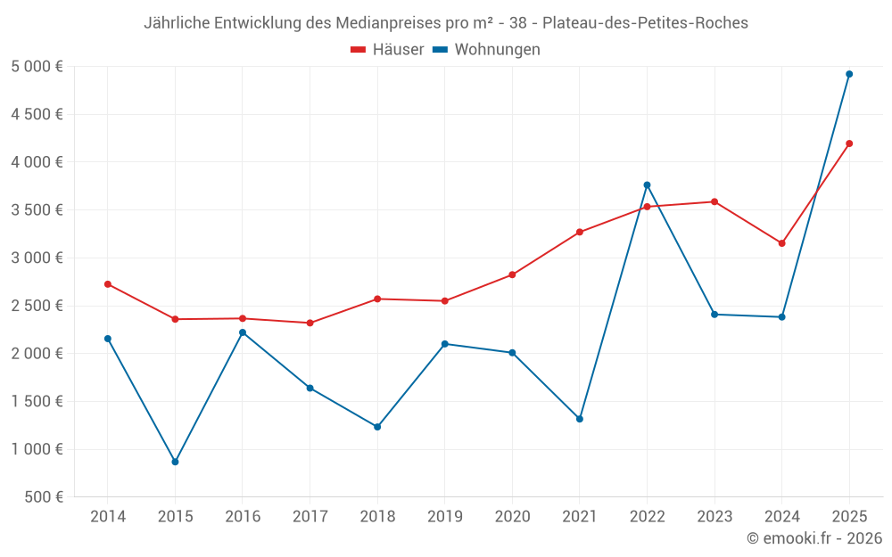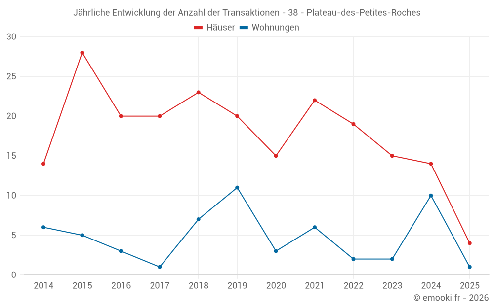 Der Durchschnittspreis auf den 28 Hausgeschäften der letzten 24 Monate in der Gemeinde Plateau-des-Petites-Roches betrug 3 519 € pro Quadratmeter für einen mittleren Immobilienwert von 374 655 €. Über diesen Zeitraum hinweg lagen 60% der Transaktionen zwischen 2 897 und 4 556 € pro Quadratmeter (vom 2. bis zum 8. Dezil).