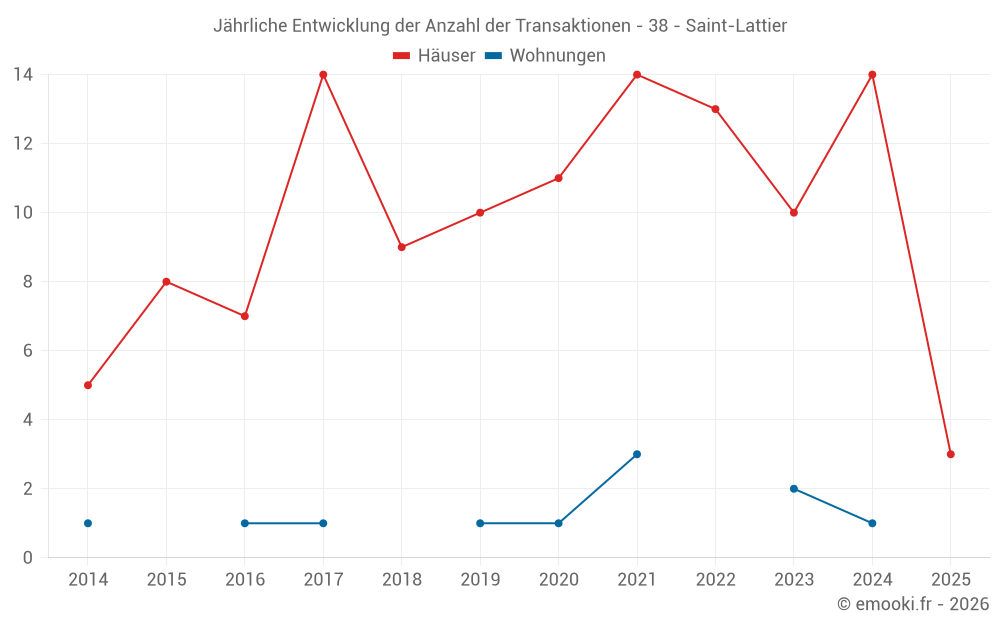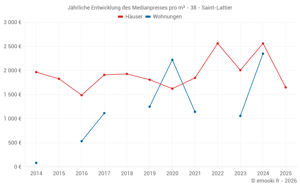 Der Durchschnittspreis auf den 23 Hausgeschäften der letzten 24 Monate in der Gemeinde Saint-Lattier betrug 2 101 € pro Quadratmeter für einen mittleren Immobilienwert von 219 550 €. Über diesen Zeitraum hinweg lagen 60% der Transaktionen zwischen 1 510 und 2 716 € pro Quadratmeter (vom 2. bis zum 8. Dezil).