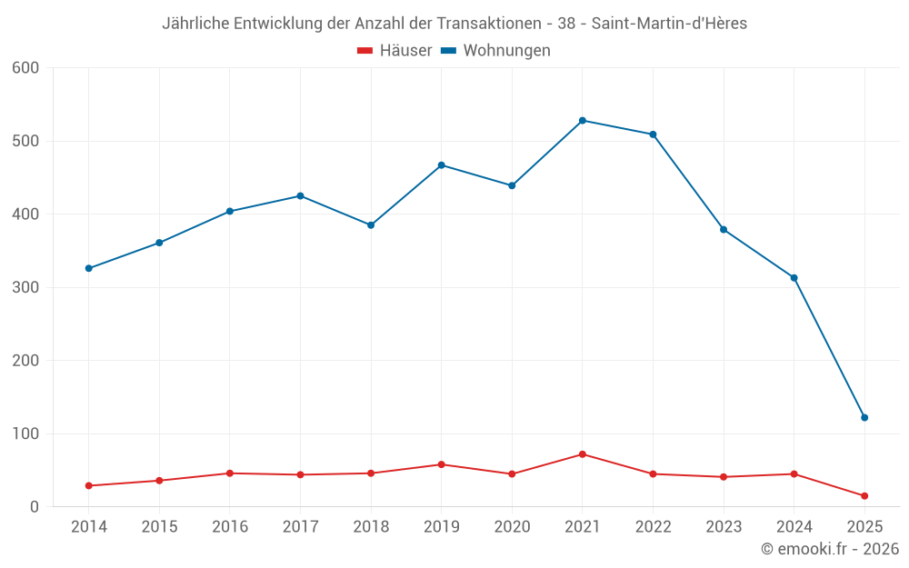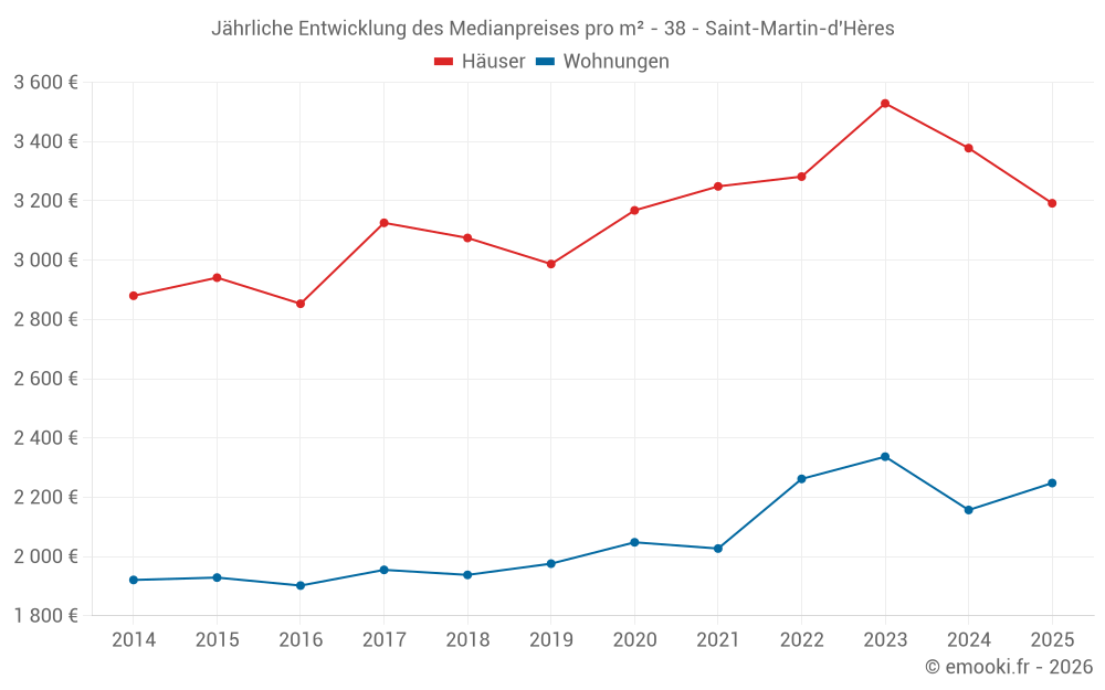 Der Durchschnittspreis auf den 43 Hausgeschäften der letzten 12 Monate in der Gemeinde Saint-Martin-d'Hères betrug 3 426 € pro Quadratmeter für einen mittleren Immobilienwert von 327 500 €. Über diesen Zeitraum hinweg lagen 60% der Transaktionen zwischen 2 609 und 3 991 € pro Quadratmeter (vom 2. bis zum 8. Dezil).