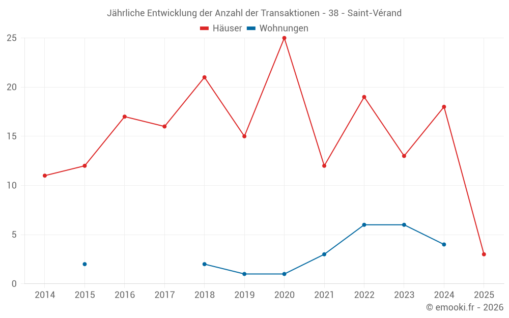Der Durchschnittspreis auf den 16 Hausgeschäften der letzten 12 Monate in der Gemeinde Saint-Vérand betrug 2 686 € pro Quadratmeter für einen mittleren Immobilienwert von 264 020 €. Über diesen Zeitraum hinweg lagen 60% der Transaktionen zwischen 1 905 und 3 126 € pro Quadratmeter (vom 2. bis zum 8. Dezil).