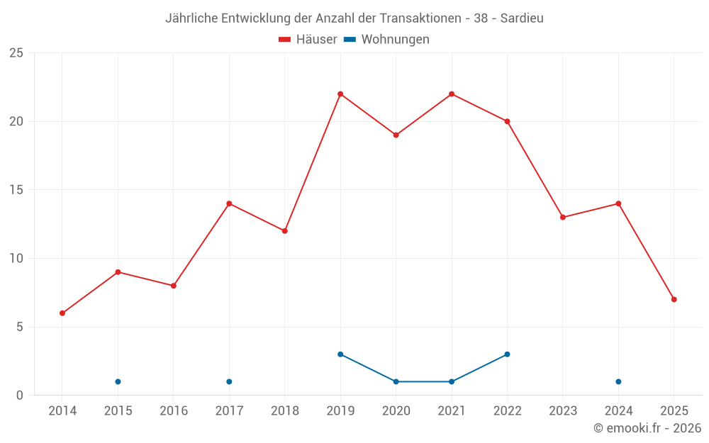Der Durchschnittspreis auf den 29 Hausgeschäften der letzten 24 Monate in der Gemeinde Sardieu betrug 2 375 € pro Quadratmeter für einen mittleren Immobilienwert von 249 850 €. Über diesen Zeitraum hinweg lagen 60% der Transaktionen zwischen 1 761 und 2 954 € pro Quadratmeter (vom 2. bis zum 8. Dezil).
