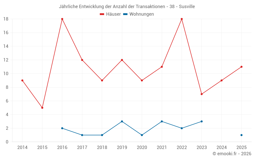 Der Durchschnittspreis auf den 20 Hausgeschäften der letzten 24 Monate in der Gemeinde Susville betrug 2 152 € pro Quadratmeter für einen mittleren Immobilienwert von 198 500 €. Über diesen Zeitraum hinweg lagen 60% der Transaktionen zwischen 1 631 und 2 948 € pro Quadratmeter (vom 2. bis zum 8. Dezil).