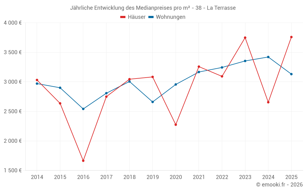 Der Durchschnittspreis auf den 36 Wohnungstransaktionen der letzten 24 Monate in der Gemeinde La Terrasse betrug 3 346 € pro Quadratmeter für einen mittleren Immobilienwert von 191 525 €. Über diesen Zeitraum hinweg lagen 60% der Transaktionen zwischen 2 652 und 3 780 € pro Quadratmeter (vom 2. bis zum 8. Dezil).