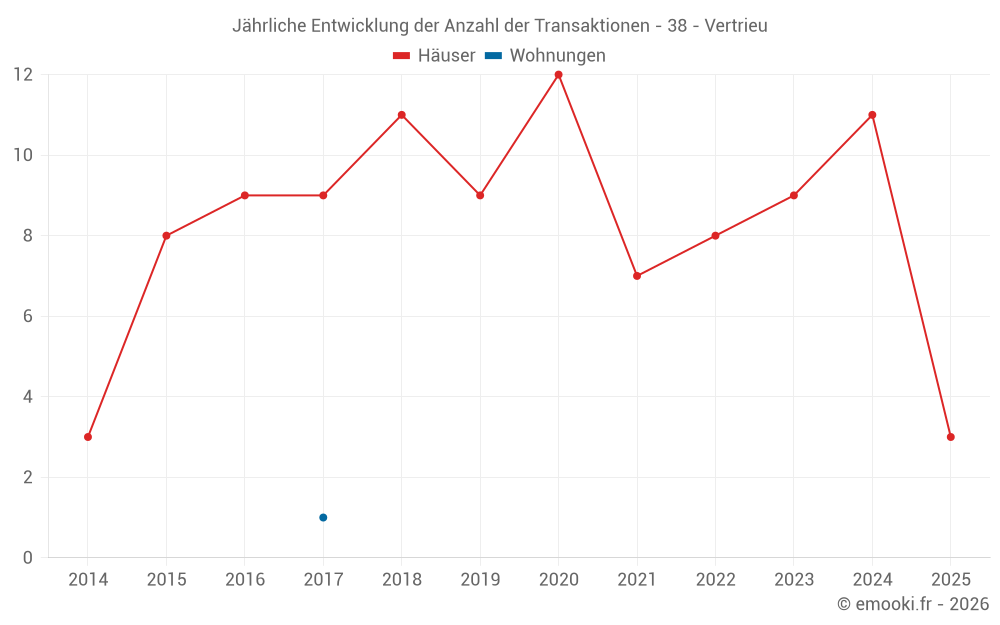 Der Durchschnittspreis auf den 18 Hausgeschäften der letzten 24 Monate in der Gemeinde Vertrieu betrug 2 256 € pro Quadratmeter für einen mittleren Immobilienwert von 218 615 €. Über diesen Zeitraum hinweg lagen 60% der Transaktionen zwischen 1 301 und 2 846 € pro Quadratmeter (vom 2. bis zum 8. Dezil).