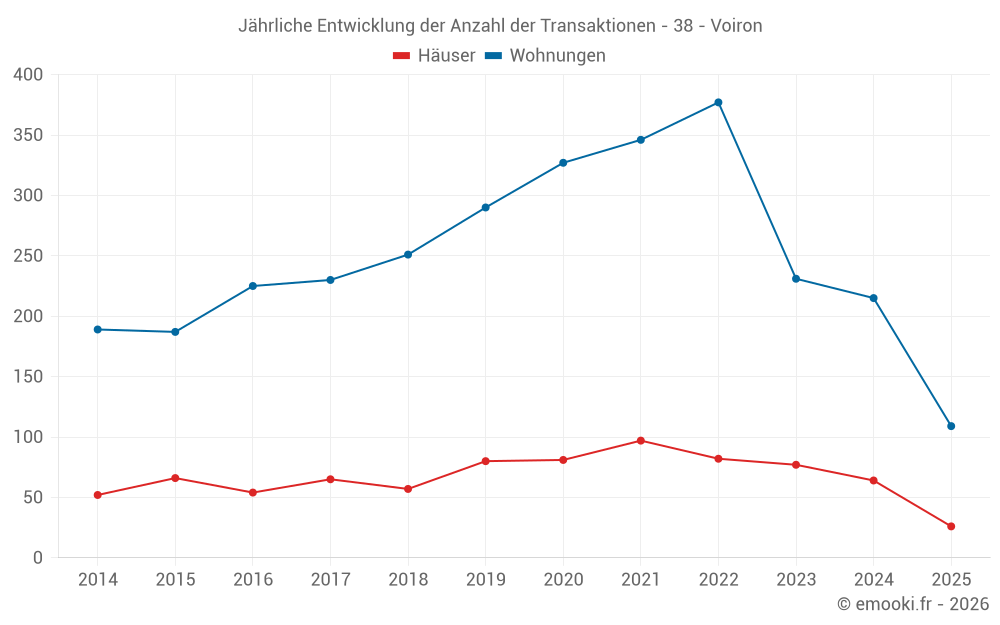 Der Durchschnittspreis auf den 26 Hausgeschäften der letzten 6 Monate in der Gemeinde Voiron betrug 3 292 € pro Quadratmeter für einen mittleren Immobilienwert von 355 525 €. Über diesen Zeitraum hinweg lagen 60% der Transaktionen zwischen 2 768 und 4 005 € pro Quadratmeter (vom 2. bis zum 8. Dezil).