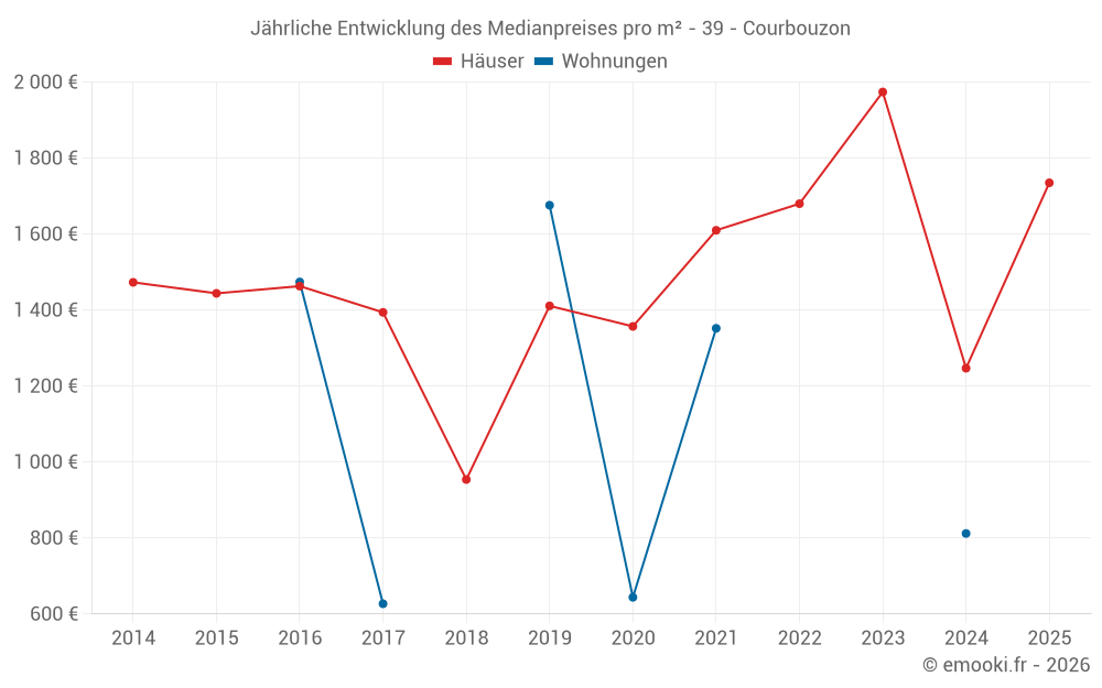 Der Durchschnittspreis auf den 16 Hausgeschäften der letzten 24 Monate in der Gemeinde Courbouzon betrug 1 697 € pro Quadratmeter für einen mittleren Immobilienwert von 179 125 €. Über diesen Zeitraum hinweg lagen 60% der Transaktionen zwischen 793 und 1 974 € pro Quadratmeter (vom 2. bis zum 8. Dezil).