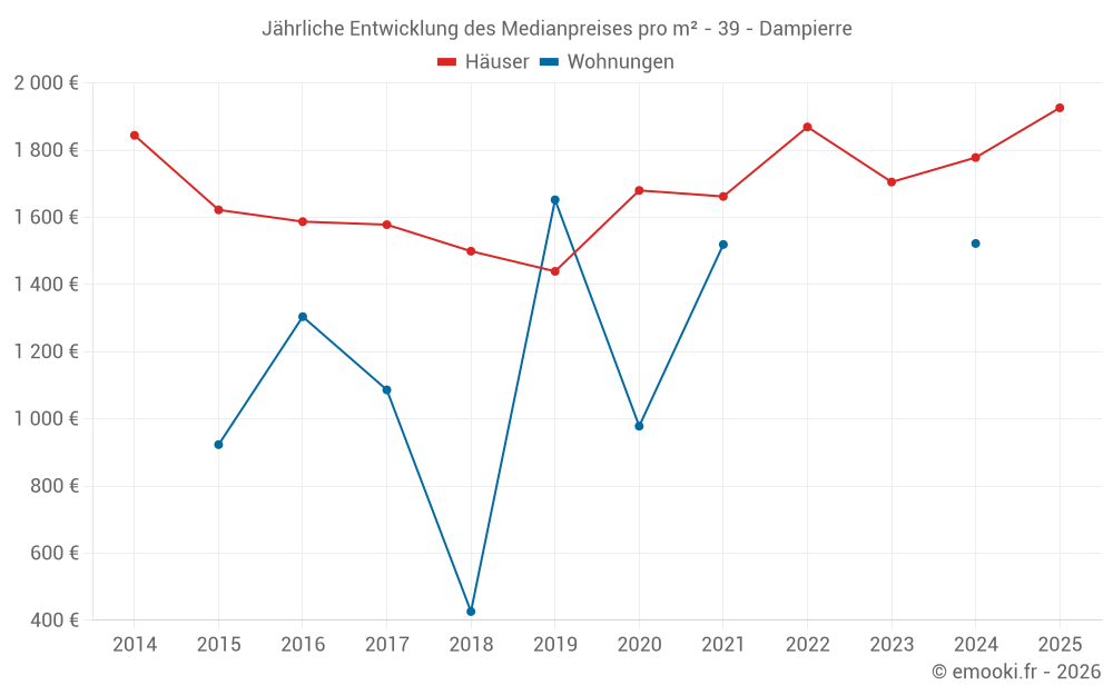 Der Durchschnittspreis auf den 20 Hausgeschäften der letzten 24 Monate in der Gemeinde Dampierre betrug 1 778 € pro Quadratmeter für einen mittleren Immobilienwert von 201 800 €. Über diesen Zeitraum hinweg lagen 60% der Transaktionen zwischen 1 267 und 2 404 € pro Quadratmeter (vom 2. bis zum 8. Dezil).
