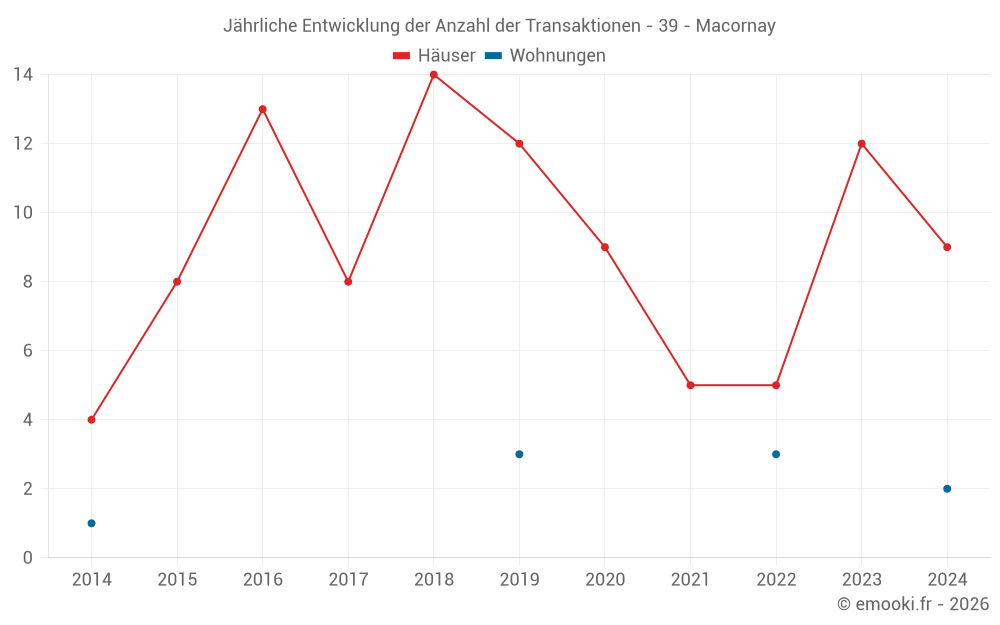 Der Durchschnittspreis auf den 14 Hausgeschäften der letzten 24 Monate in der Gemeinde Macornay betrug 2 145 € pro Quadratmeter für einen mittleren Immobilienwert von 201 930 €. Über diesen Zeitraum hinweg lagen 60% der Transaktionen zwischen 1 754 und 2 352 € pro Quadratmeter (vom 2. bis zum 8. Dezil).