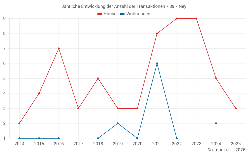 Der Durchschnittspreis auf den 15 Hausgeschäften der letzten 24 Monate in der Gemeinde Ney betrug 1 777 € pro Quadratmeter für einen mittleren Immobilienwert von 210 000 €. Über diesen Zeitraum hinweg lagen 60% der Transaktionen zwischen 942 und 2 162 € pro Quadratmeter (vom 2. bis zum 8. Dezil).