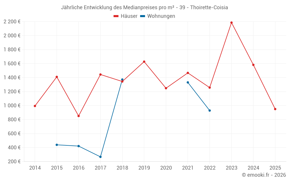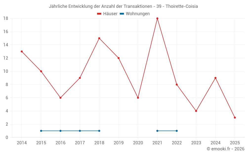 Der Durchschnittspreis auf den 14 Hausgeschäften der letzten 24 Monate in der Gemeinde Thoirette-Coisia betrug 1 514 € pro Quadratmeter für einen mittleren Immobilienwert von 131 000 €. Über diesen Zeitraum hinweg lagen 60% der Transaktionen zwischen 819 und 2 067 € pro Quadratmeter (vom 2. bis zum 8. Dezil).